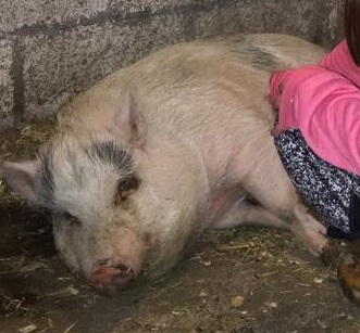 Meet Rosie, a sweet five year-old pot-bellied pig available for adoption at Oinking Acres Farm Rescue & Sanctuary! Rosie was abandoned by her previous owners when they moved (how could someone do that?!), although being left behind didn’t take away her sweet and loving personality. At 100 pounds she is full-grown and is an extremely well-mannered girl, keeping her stall nice and neat. Rosie also loves to run around the yard, eating whatever snack she can find (like watermelon and pumpkin), and gets along with everyone, people and animals alike. If you’re in the market to adopt two pigs, she’s BFFs (Best Farm Friends) with fellow adoptable, Elvis Pigsley, and it would be wonderful if they could find a forever home together! Pot-bellied pigs are similar to dogs in the sense that they can be house-trained (although Rosie and Elvis prefer to be outdoor pigs), leash-trained and can learn tricks, but they’re also very stubborn and sensitive. The average lifespan of a pot-bellied pig is anywhere from 12 to 20 years and if you put in the time and love with your little oinker, you’ll have the undying love and loyalty of your pig. If you’re interested in a snorting good time and would like to adopt Rosie (and Elvis), please fill out an adoption application online. The adoption fee is $150 for one pig and $275 for a pair, though if you’re out of state it costs an additional $30 and your pig must have a health certificate (Oinking Acres takes their pigs to Purdue Large Animal Hospital to have this done and receive the document).