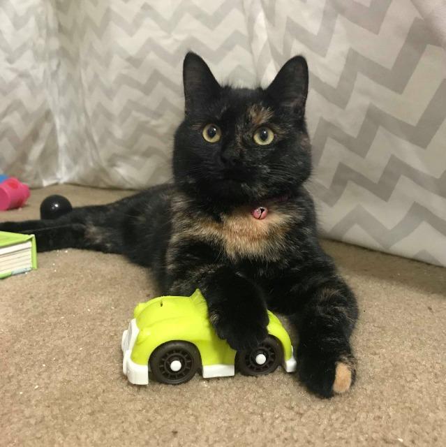 Meet Scramble, a beautiful 10 month-old tortoiseshell kitten available for adoption through Mended Hearts Rescue! Scramble is a perfect mix of laid-back house cat and curious explorer, known for her box-stealing and sneak-pouncing antics! Scramble enjoys human affection (especially chin scratches) and is very friendly when she meets new people, but because of her penchant for sneak-pouncing she would be best in a home without small children. She does fine with other cats and dogs, if a little skeptical at first of canine companions. If you’re interested in giving Scramble her forever home, please fill out an adoption inquiry on the Mended Hearts website. Scramble’s adoption fee is $65.