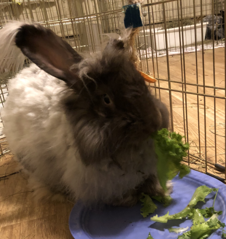 Meet Tikvah, a fabulously fluffy four year-old Giant French Angora available for adoption from the Indiana House Rabbit Society! Tikvah is a very cautious girl due to being confiscated from a situation where she had to fight other rabbits for food. Her foster mom has worked very hard to help her deal with food insecurity, but she’s very slow to trust because the people from her former home were not very kind. She has learned to enjoy gentle petting from her foster mom, but will definitely need a patient home with extensive rabbit experience in order to give her the best life possible. Do you speak fluent rabbit and feel you’re up to giving this sweet furball her forever home? If you want Tikvah to be a part of your forever family, please fill out the adoption questionnaire and check the link on adopting a rabbit from the Indiana House Rabbit Society. Tikvah’s adoption fee is $65 (which helps cover her spay surgery) and she’ll come home with a small bag of hay, a small bag of pellets and her veterinary history.