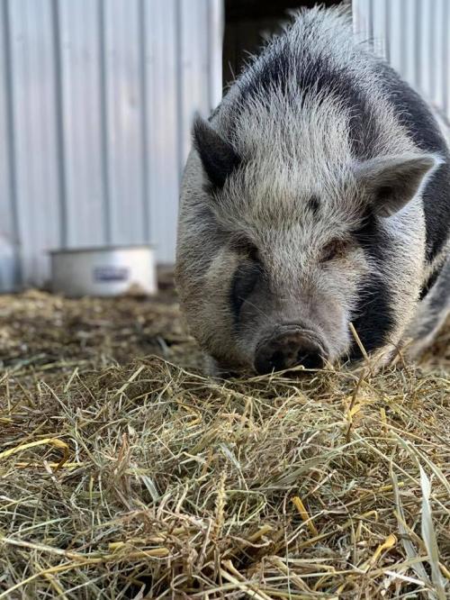Meet Maggie, an adorable five or six year-old mini pig available for adoption through A Critter’s Chance Rescue! Maggie is a very dominant girl towards other pigs and must be fed separately, but when it comes to people she is super easygoing and loves to have her ears and belly scratched! When she was a younger pig she was kept inside and if her forever family puts in just a little bit of work, she would probably be a very happy girl to be back indoors. Pigs are incredibly smart and can make fantastic indoor pets! They are similar to dogs in the sense that they can be house-trained, leash-trained and can learn tricks, but they’re also very stubborn and sensitive. If you put in the time and love with your little oinker, you’ll have the undying love and loyalty of your pig. If you’re interested in giving Maggie her forever home, please contact Kelly Thomas with A Critter’s Chance rescue in Plainfield, either by phone [(765) 430-5610] or email (samboni95@gmail.com). Maggie’s adoption fee is $150 and I’ve included the link to the pig-specific adoption application.