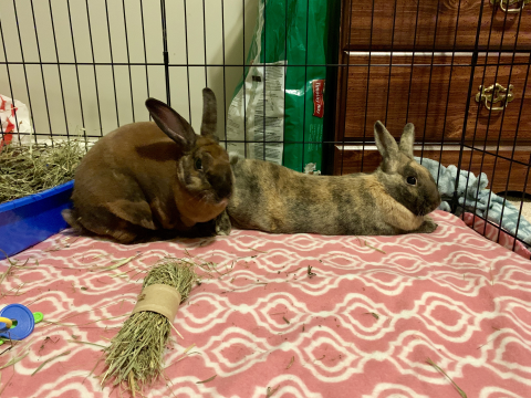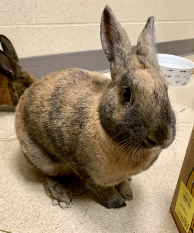 Meet Moonpie and Noodle, a bonded pair of two year-old mini Rex rabbits available for adoption through the Indiana House Rabbit Society! Moonpie and Noodle are a couple of seriously special bunnies … they’re actually both hermaphrodites and have both male AND female reproductive organs. They’ve both been spayed and neutered and this abnormality hasn’t affected their personalities in any way, this bonded pair is friendly, sweet and social! Moonpie and Noodle also were born with a genetic condition that causes their ear canals to be nearly closed, which makes them harder of hearing than a normal bunny, but except for being a little easier to startle you would never know. They like toys they can chew, like cardboard, wooden toys and newspaper (they’re a couple of little shredders!) and are very cuddly, loving head and cheek rubs and Eskimo kisses! If you want Moonpie and Noodle to be a part of your forever family, please fill out the adoption questionnaire and check the link on adopting a rabbit from the Indiana House Rabbit Society. Their adoption fee is $110 (which helps cover their spay and neuter surgeries) and they’ll come home with a small bag of hay, a small bag of pellets and their veterinary history.