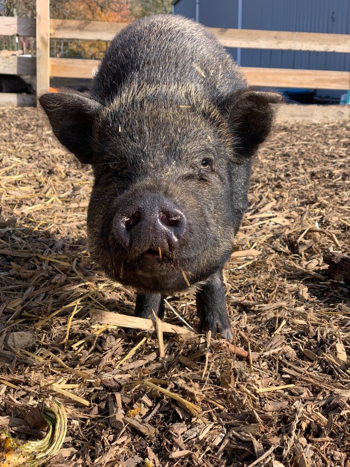 Meet Griz and Koda, an adorable bonded pair of male pot-bellied pigs available for adoption at Oinking Acres Farm Rescue & Sanctuary! Griz is five years old and, though super sweet, is very hand-shy and does not care for human touch. Koda is two years old and, though also hand-shy, is a curious boy and is more open to human interaction. Griz and Koda would make great pasture pets where they can just be themselves, but with some time, love and patience, there’s definitely potential for these boys to become more affectionate! Pot-bellied pigs are similar to dogs in the sense that they can be house-trained, leash-trained and can learn tricks, but they’re also very stubborn and sensitive. The average lifespan of a pot-bellied pig is anywhere from 12 to 20 years and if you put in the time and love with your little oinker, you’ll have the undying love and loyalty of your pig. These precious little piggies have been neutered and microchipped and are more than ready to find their forever home. If you’re interested in a snorting good time and would like to adopt Griz and Koda, please fill out an adoption application online. Their adoption fee is $275, though if you’re out of state it costs an additional $100 per pig and your pig must have a health certificate (Oinking Acres takes their pigs to Purdue Large Animal Hospital to have this done and receive the document).