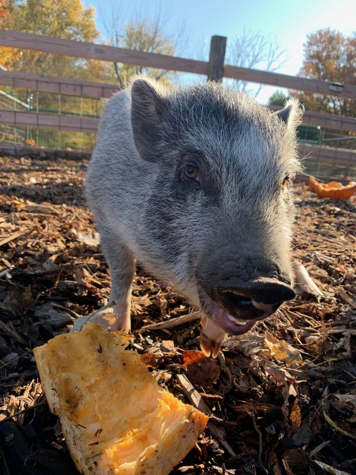 Meet Maisy and Milton, a bonded pair of eight month-old pot-bellied pigs available for adoption at Oinking Acres Farm Rescue & Sanctuary! Both Maisy (look at those GORGEOUS gold eyes!) and Milton can be a bit shy at first, but they warm up quickly and Maisy is especially affectionate! Milton has loads of unlocked potential to become the best pet, he just needs a patient and loving forever family to give him a chance! Pot-bellied pigs are similar to dogs in the sense that they can be house-trained, leash-trained and can learn tricks, but they’re also very stubborn and sensitive. The average lifespan of a pot-bellied pig is anywhere from 12 to 20 years and if you put in the time and love with your little oinker, you’ll have the undying love and loyalty of your pig. These precious little piggies have been spayed and neutered (respectively), microchipped and are more than ready to find their forever home. If you’re interested in a snorting good time and would like to adopt Maisy and Milton, please fill out an adoption application online. Their adoption fee is $275, though if you’re out of state it costs an additional $100 per pig and your pig must have a health certificate (Oinking Acres takes their pigs to Purdue Large Animal Hospital to have this done and receive the document).