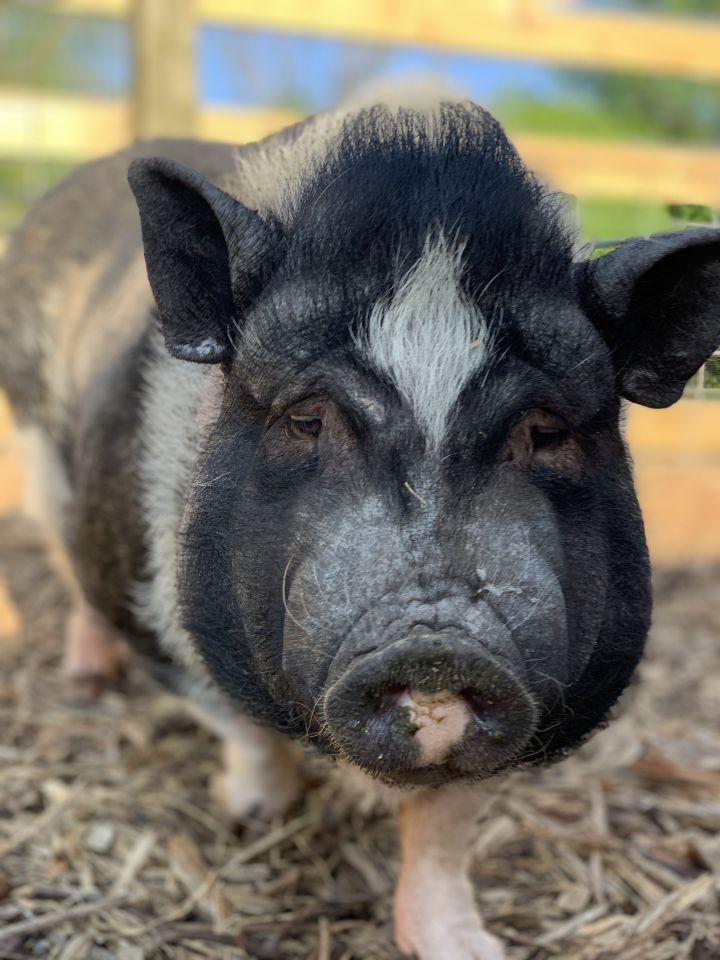 Meet Charolette, a cautious five year-old pot-bellied pig available for adoption at Oinking Acres Farm Rescue & Sanctuary! Charolette is a very sweet girl, but gets overwhelmed around large groups of people and would need a quiet and patient forever home. She also was attacked by a dog prior to coming to the rescue and needs to be in a home without dogs (and probably without small children due to her cautious nature). She does well with most other animals, however, as long as they’re docile and easy-going. Pot-bellied pigs are similar to dogs in the sense that they can be house-trained, leash-trained and can learn tricks, but they’re also very stubborn and sensitive. The average lifespan of a pot-bellied pig is anywhere from 12 to 20 years and if you put in the time and love with your little oinker, you’ll have the undying love and loyalty of your pig. Charolette has been spayed and microchipped and is more than ready to find her forever home. If you’re interested in a snorting good time and would like to adopt Charolette, please fill out an adoption application online. Her adoption fee is $150, though if you’re out of state it costs an additional $100 and your pig must have a health certificate (Oinking Acres takes their pigs to Purdue Large Animal Hospital to have this done and receive the document).
