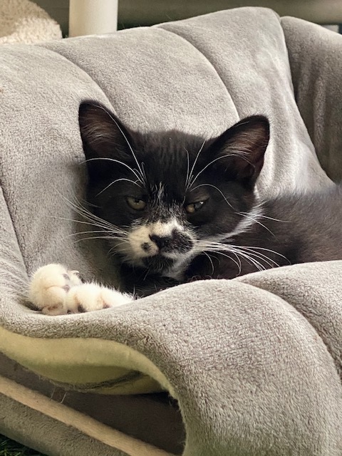 – a shy, but sweet, girl who is still getting used to people, but enjoys living the good life of a spoiled, indoor kitty!