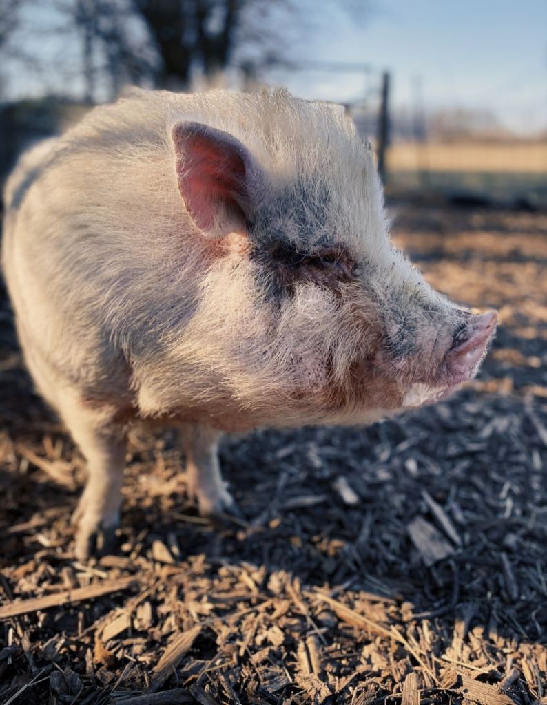 Meet Miss Jiggles, an adorable pot-bellied pig available for adoption at Oinking Acres Farm Rescue & Sanctuary! Miss Jiggles was found as stray with her partner, Mr. Wiggles, near Love’s Truck Stop in Richmond, Indiana, and she is estimated to be around four or five years old and 120 pounds. Miss Jiggles is extremely sweet and friendly and would make a great outdoor companion for a lucky family! Unfortunately, Mr. Wiggles passed away from cancer and Miss Jiggles is a bit lonely, so she could benefit from another piggy companion. Pot-bellied pigs are similar to dogs in the sense that they can be house-trained, leash-trained and can learn tricks, but they’re also very stubborn and sensitive. The average lifespan of a pot-bellied pig is anywhere from 12 to 20 years and if you put in the time and love with your little oinker, you’ll have the undying love and loyalty of your pig. Miss Jiggles is spayed and she is microchipped and more than ready to find her forever home. If you’re interested in a snorting good time and would like to adopt Miss Jiggles, please fill out an adoption application online. Her adoption fee is $150, though if you’re out of state it costs an additional $100 per pig and your pigs must have a health certificate (Oinking Acres takes their pigs to Purdue Large Animal Hospital to have this done and receive the document).