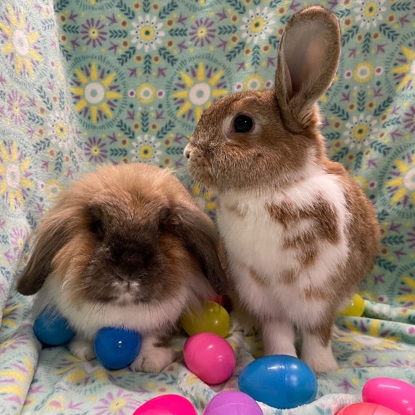 Meet Cocoa and Cinnamon, an adorable bonded pair of Lionhead lop-eared mixed rabbits available for adoption at IndyCLAW Rescue! Cocoa and Cinnamon were part of a group of four bunnies recently surrendered that have been split into two pairs with the hope of an increased chance that all will be adopted. Cocoa (male) is the more reserved and shy of the two, preferring to take his time in getting to know people, though he’s a curious boy that loves to explore. Cinnamon (female) is very outgoing, coming to the front of her pen to greet visitors and check out new situations. Neither bunny enjoys being picked up and held, enjoying their interactions with humans to be on solid ground. This precious pair is quite the dynamic duo, so hop on over to IndyCLAW and fall in love with these sweet honey buns! Cocoa and Cinnamon’s adoption fee is $150 for the pair. For more information on Cocoa and Cinnamon, please visit IndyCLAW‘s website or email adopt@indyclaw.org … visits are by appointment only!