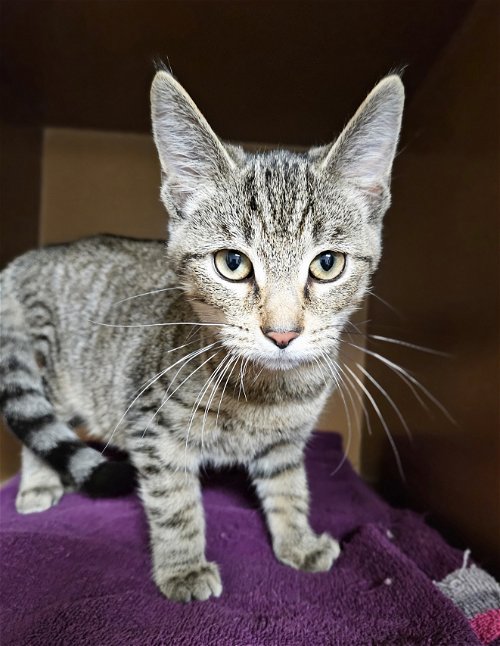 Meet Alvin, a curious four month-old tabby kitten available for adoption through the Hancock County Humane Society! Alvin came to the shelter with his two brothers, Simon and Theodore, and while his brothers have been adopted, Alvin is still in search of his forever home. This is one curious kitten and one of his favorite activities is to explore! Alvin has typical kitten energy, but he loves to come over for cuddles when he’s done playing and is the sweetest boy! Alvin loves everyone and everything he meets, people and other cats alike, and would do well in a home with children and/or another kitty friend. Are you the forever home where Alvin can be the star? Shelter hours are by appointment only on Saturdays and the shelter is closed on holidays. Two shelter visits are also required before the adoption can be completed and adoption fees vary based on age of cat, age of adopter, etc., so please click the link above for more information. (Note: During the month of October the shelter will be closed for renovations and all contact about available cats needs to be done through the Smitten Kitten Cafe.)